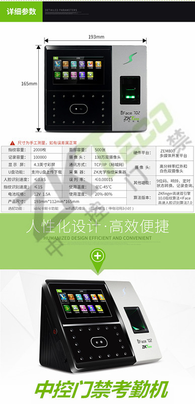 中控面部考勤機iface702P 人臉指紋識別門禁